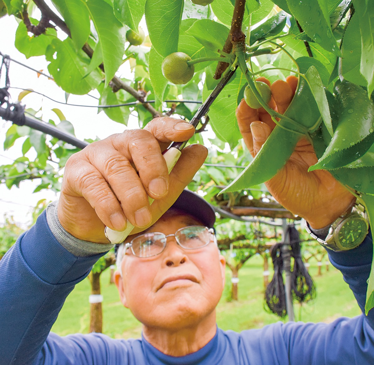 連休明けの5月13日、区内の果樹生産農家では浜なしの摘果作業が進んでいた。
