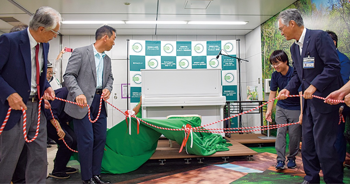 市営地下鉄グリーンライン中山駅で6月17日、駅構内に設置された「中山まちピアノ♪♪♪」の除幕式が行われた。除幕式には、三村庄一市交通局長、佐藤康博緑区長らが出席。関係者によって除幕が行われると、真っ白なピアノが姿を現した。