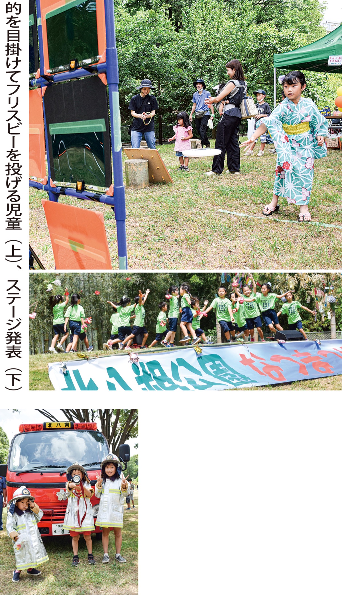 同愛護会のブースでは公園内で伐採した竹を利用した竹細工などを販売。保健活動推進員は血圧測定などの健康チェックを実施したほか、北八朔日曜朝一直売会ではナスやタマネギなどの野菜や手作りジャムなどを販売していた。輪投げやフリスビーでの的当てゲームが体験できる緑が丘中学校陸上部のブースは人気を集め、浴衣姿で的当てを体験した落合紗英さん(山下小2年)は「難しかったけど楽しかった」と笑顔を見せた。