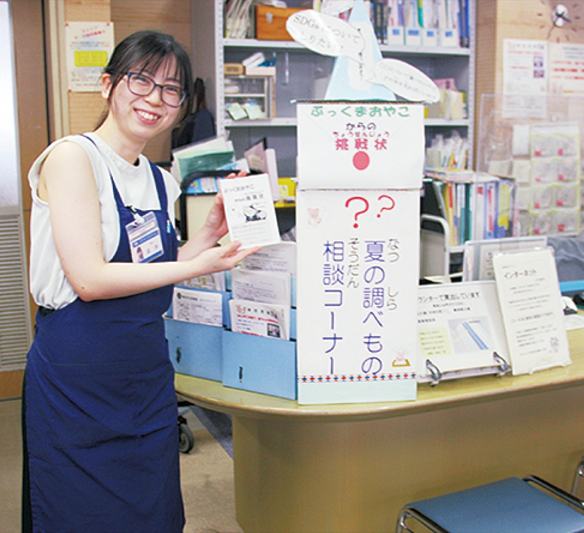 また、クイズ形式で書籍の探し方を学べる、小学生向けの「ぶっくまおやこからの挑戦状」と題した企画も実施。専用の冊子にクイズの答えを記入し、1番カウンターに持参するとプレゼントをもらえる。司書の床井満里菜さんは「楽しみながら図書館の活用方法を身に付けてくれたら」と話している。
