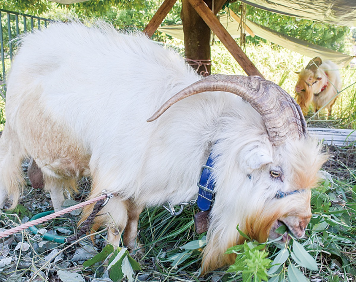 草刈りに挑戦したのは、玄海田公園(長津田みなみ台)で管理されているヤギの「げん」と「かい」。同取組は、日ごろ玄海田公園内の3カ所で繋牧され園内の除草作業に一役買っているヤギを多くの人に周知してもらうことを目的に試験的に実施したもの。緑土木事務所が企画し、同公園の指定管理者「緑とコミュニティグループ」の協力で実現した。