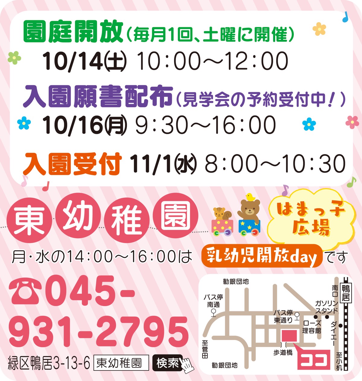 同園では来年度に向けた園児も募集中だ。願書配布は10月16日(月)から。はまっ子広場設置や満3歳児受け入れなどで子育て支援を進める同園では毎年多くの応募があるため早目の動き出しがカギとなる。詳しくは同園【電話】かHPまでお気軽に。