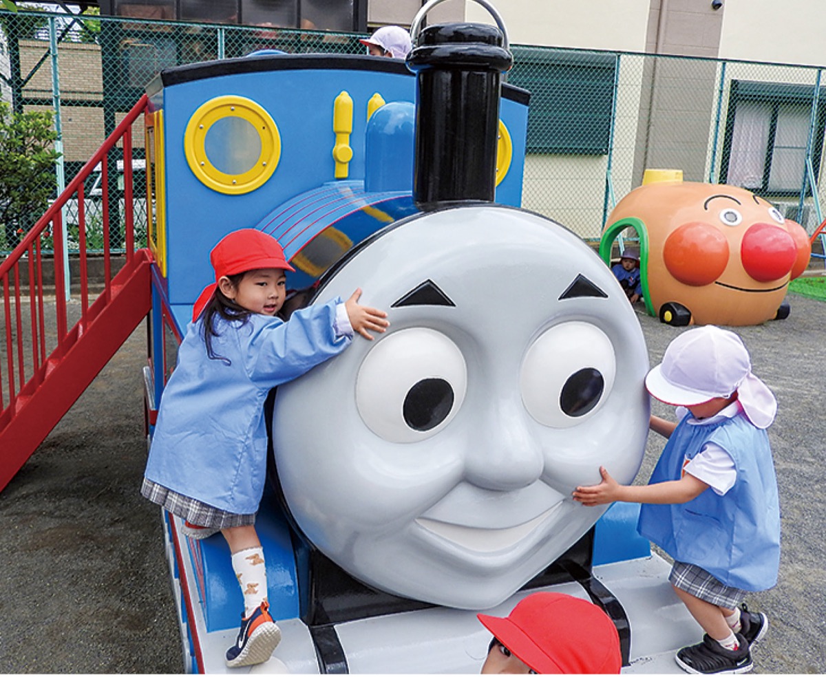 同園を訪れた親子をまず驚き喜ばせるのは、ユニークな遊具たち=写真=。誰もが知るキャラクターの遊具は小さな子どもたちに大人気。月に一度の土曜の園庭開放日には多くの親子が集まり、和気あいあいとキャラクターと一緒に写真を撮る姿が見られるとか。