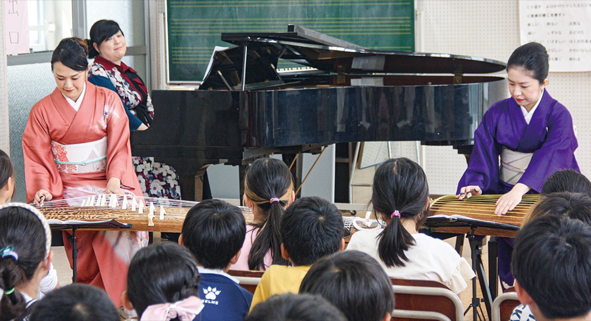 今回の授業は「子どもたちに本物の和楽器演奏を聞く機会をつくりたい」と、同校がこのプログラムに応募したことで実現した。
