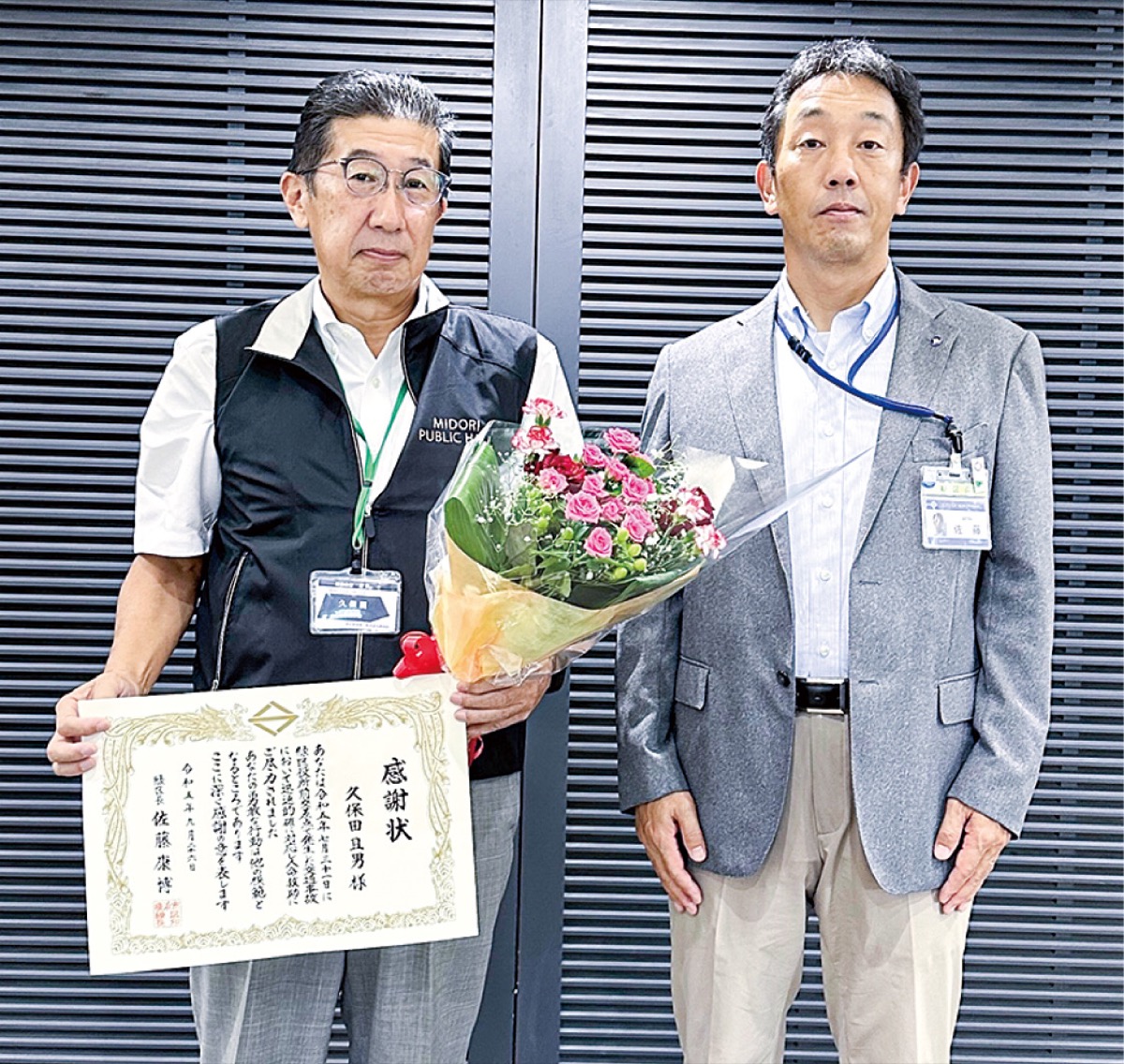 佐藤康博区長から感謝状を贈られたのは、パチンコ・スロットZoRoNの従業員の柳川智彦さんと水田哲也さん、緑公会堂の久保田且男館長、JR東日本 中山駅。区によると、事故発生後、AEDを現場に持参したり、施設内のAEDを貸し出したりするなどの対応を行ったという。