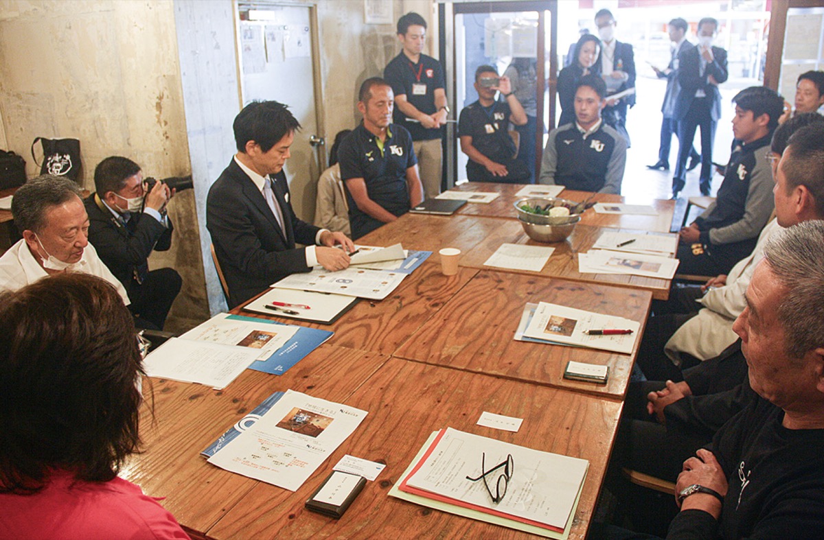 会場では大森監督が山中市長に、部員約60人が寮として竹山団地で暮らしていることなどを紹介。「地域の課題解決に取り組むことで、学生たちは物事を成すためには汗をかかなければいけないことを学んでいる」と伝えた。
