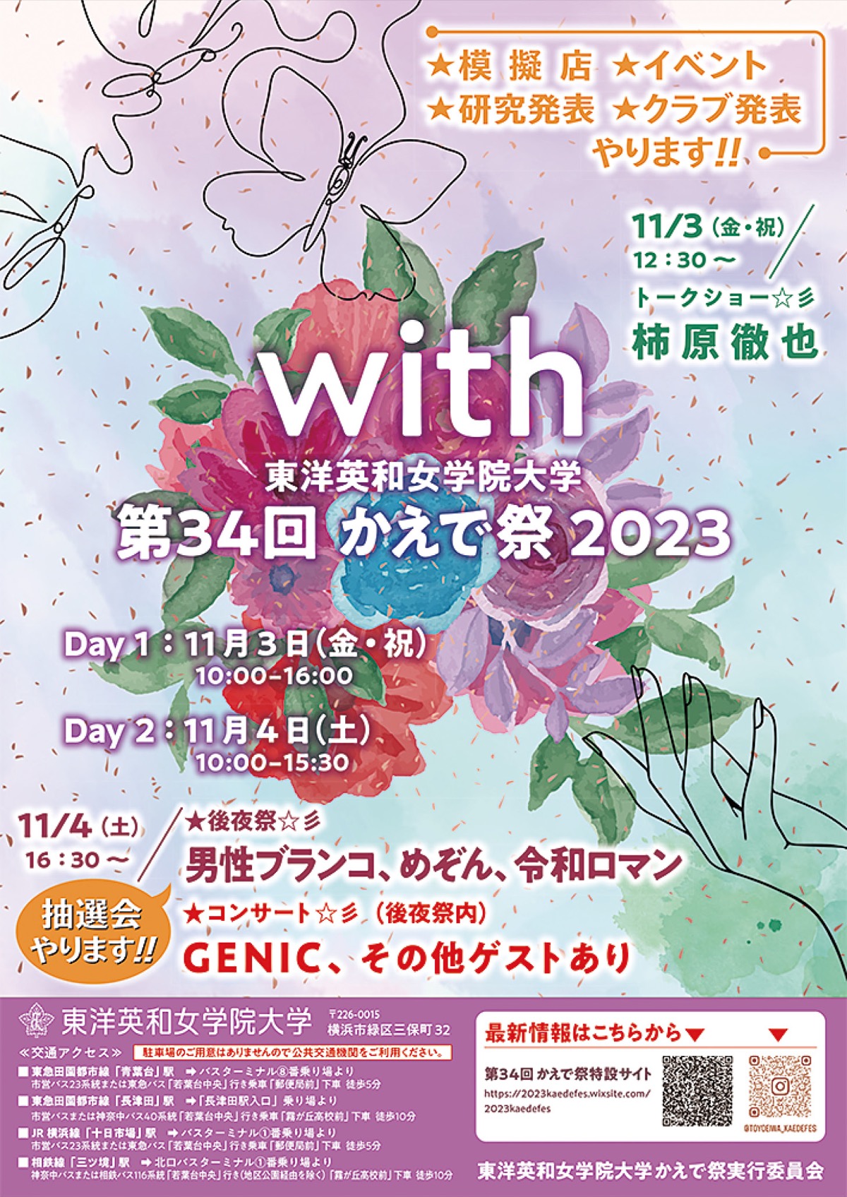 トークショーや後夜祭のチケット販売(完売の場合あり)など、かえで祭についての詳細は、同大の学生支援課【電話】045・922・5513。かえで祭の特設ウェブサイトは左記の二次元コードから。
