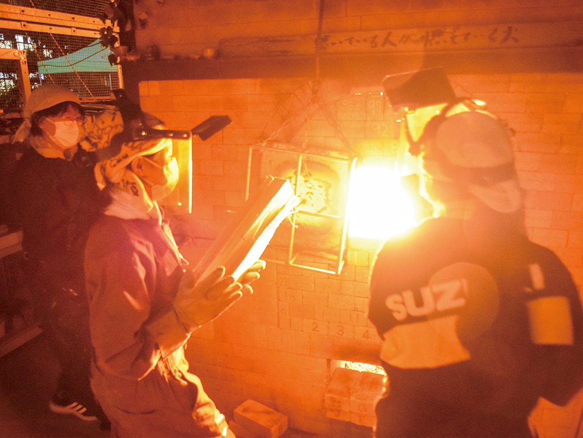 通算60回目となった今回の焼成では、初日の25日に窯内の温度を600度まで上げて水蒸気を抜き、26日の午前8時から徐々に温度を上げ、1250度前後を保ちながら昼夜問わず28日の夕方まで薪をくべ続けた。