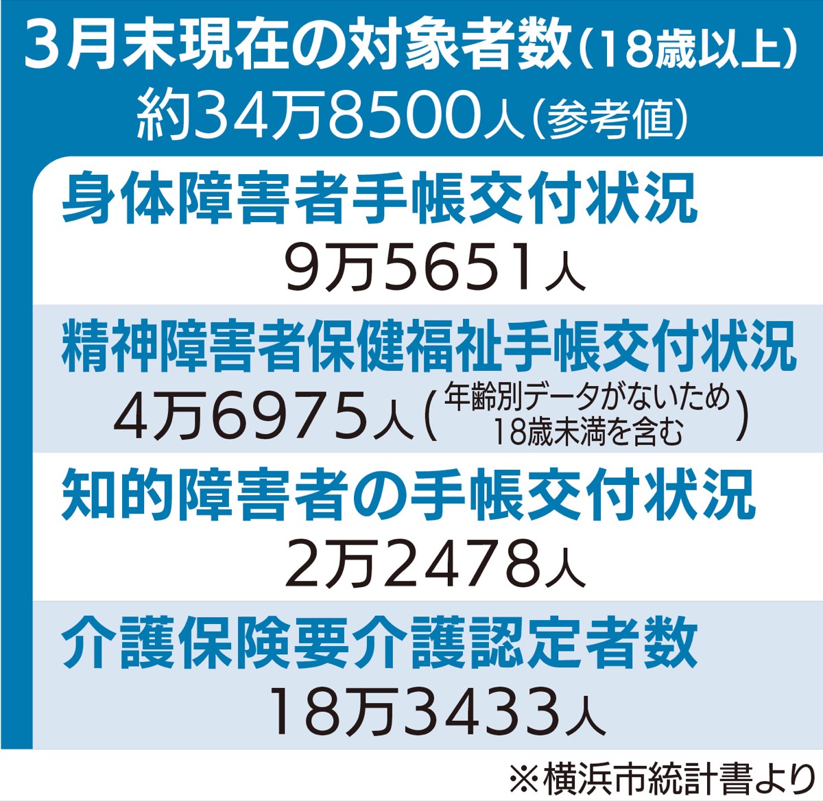 対象は身体・精神・知的の各手帳が交付されている18歳以上および、要介護認定を受けている全ての人。今年3月末現在で、おおよそ34万8500人(精神の手帳交付は年齢別情報がなく18歳未満を含む)になる。