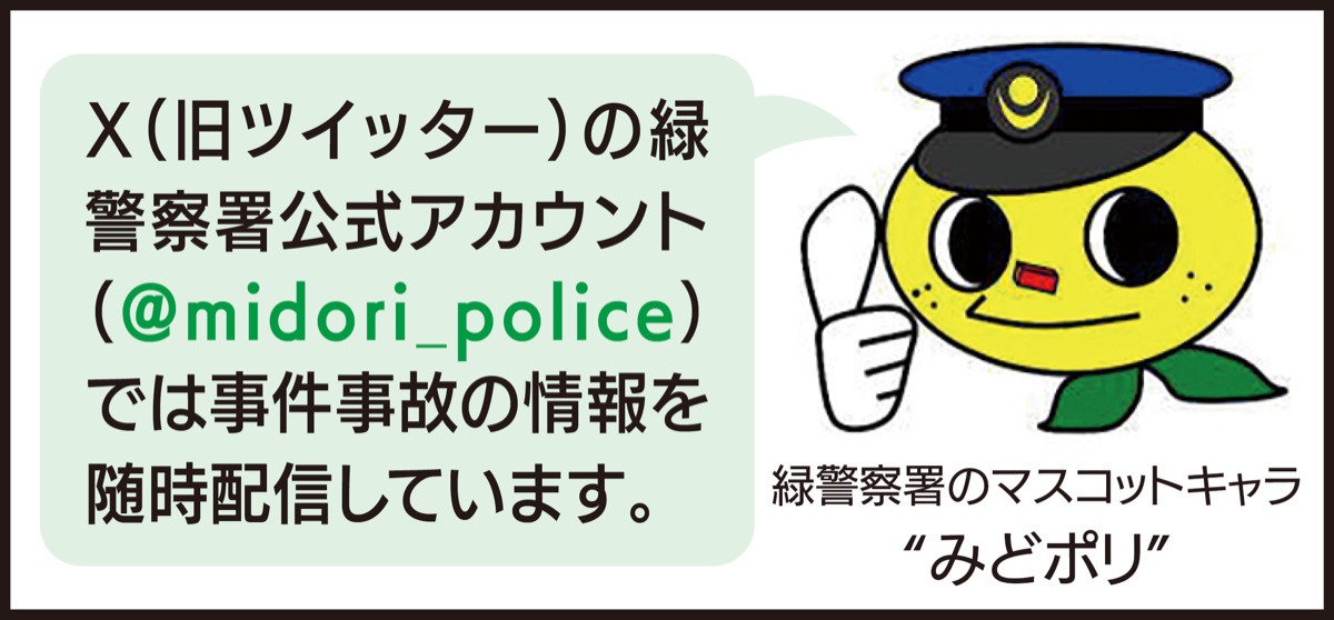 緑警察署は、同署管内で発生した事故や特殊詐欺被害情報などをX(旧ツイッター)で随時配信している。