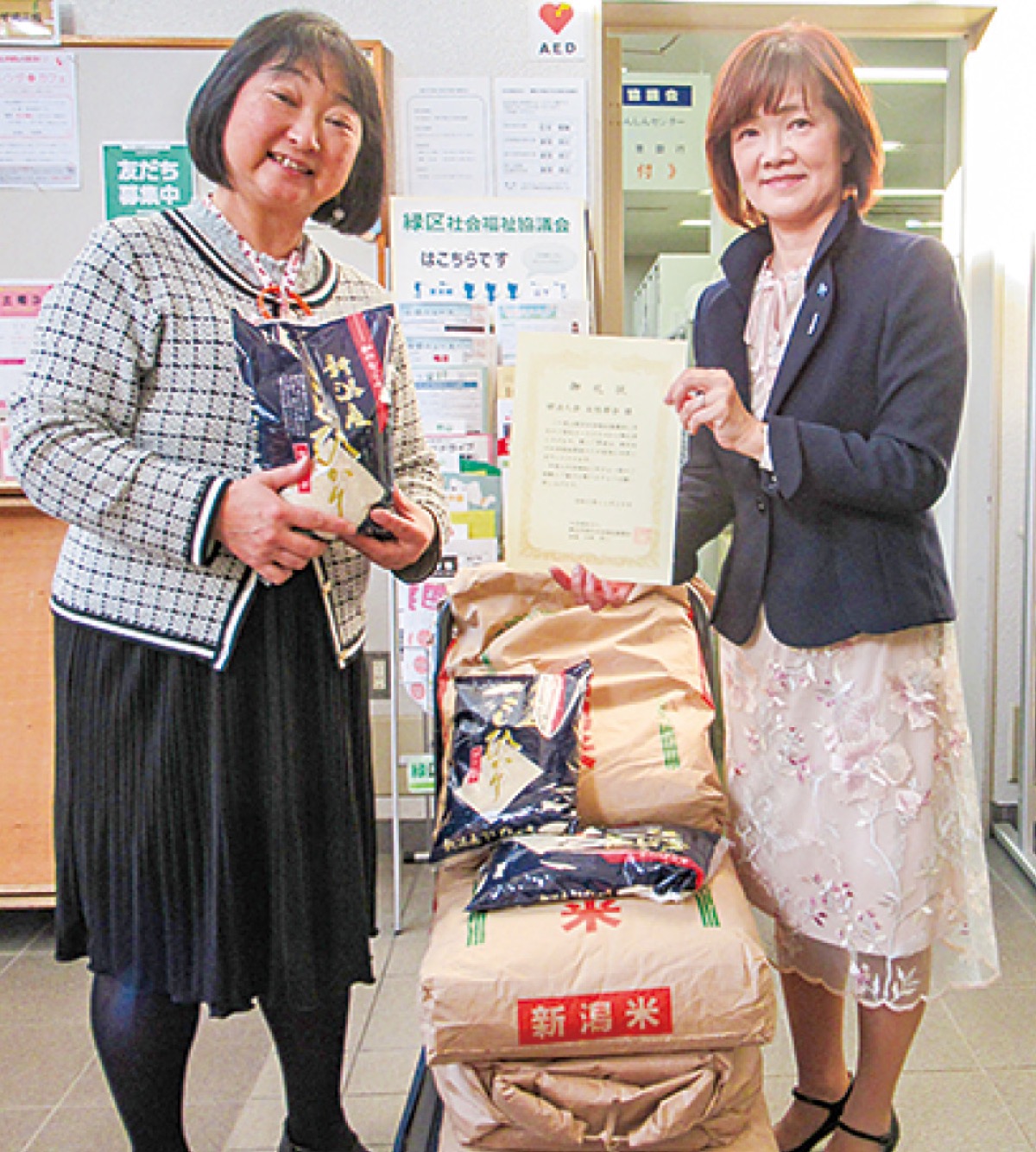 (公社)緑法人会女性部会のメンバーが11月28日、緑区社会福祉協議会を訪れ、コシヒカリ2kg40袋、計80kgを寄付した。森栄子部会長らが訪れ、緑区社協の小泉智恵美事務局次長に手渡した。資金は同女性部会が11月に開催したチャリティーゴルフ大会での寄付金から捻出したという。緑区社会福祉協議会によると、寄付された米は今後、生活に困窮する世帯へ食の支援として配布するなどの活用を予定しているという。