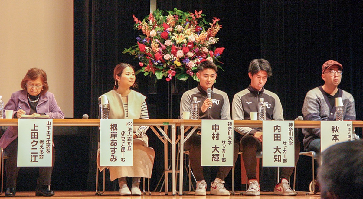 トークセッションでは、秋本さんをはじめ、山下エコ生活を考える会の上田クニ江会長、NPO法人霧が丘ぷらっとほーむの代表理事・根岸あすみさん、神奈川大学サッカー部の中村大輝さんと内田大知さんが登場。NPO法人まちづくりエージェントSIDE BEACH CITYの理事長・山口良介さんが司会・進行を務める中、スマホの利便性などについて語った。