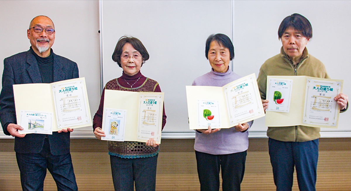 明治安田生命保険相互会社が昨年開催した「第3回 明治安田生命大人の塗り絵コンクール」で、十日市場町にある緑ほのぼの荘からは、同施設内で絵画を習っている齋藤千世子さんが佳作、徳永正義さん、諸橋宣子さん、佐藤絹代さんが特別賞を受賞した。昨年12月20日に同社の担当者の城市幸菜さんが緑ほのぼの荘で賞状を手渡した。