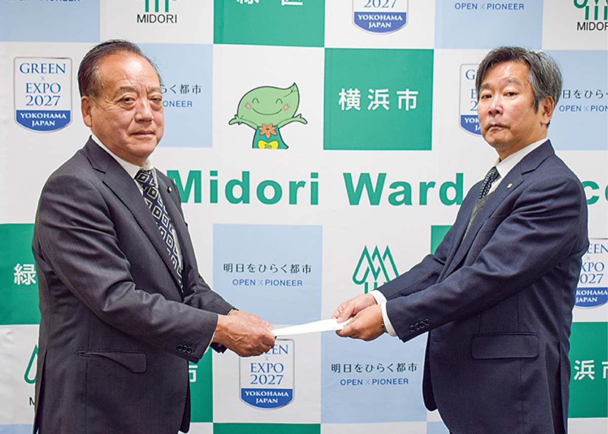 緑区役所で行われた贈呈式では、小田勉事業所長から善意銀行の窓口となっている緑区社会福祉協議会の臼井孝一会長へ目録が手渡された。