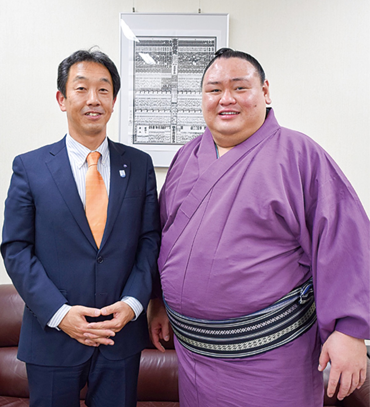 緑区出身の力士・荒篤山が昨年12月21日、緑区役所を訪れ佐藤康博緑区長に1年ぶりの場所勝ち越しを報告した。