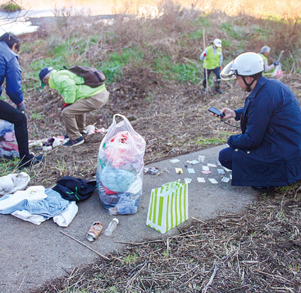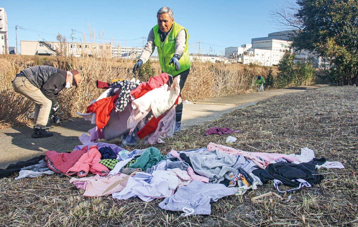 投棄されていたごみの多くは衣類。女性物や子ども服が大半を占め、中には片方だけの靴なども見付かった。警察官立ち合いのもと、1時間ほどの作業を終え、この日の回収量は70リットル入りのごみ袋5袋分に上った。