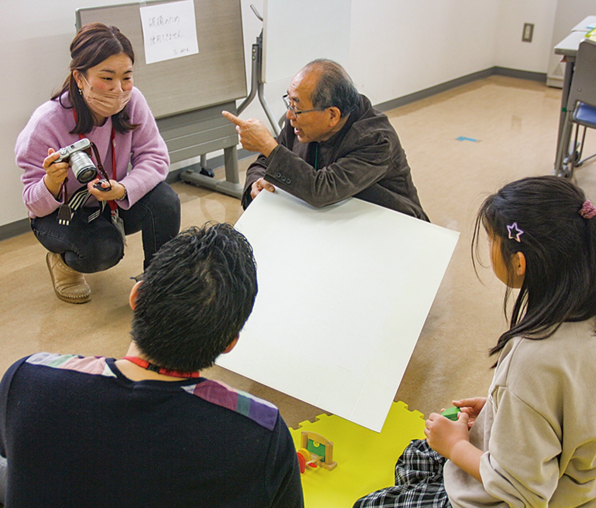 その後、保護者たちは柳瀬さんの指導のもと、実際に我が子の撮影に挑戦。積み木や風船、ドミノ倒しなどを楽しんでいる子どもを被写体に、構図やピントの合わせ方をはじめ、さまざまな表情を捉えることなどを意識しながら、撮影を楽しんだ。柳瀬さんがレフ板の使い方をアドバイスする場面もあった。