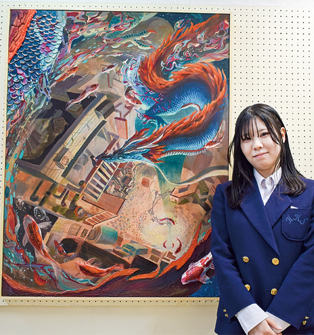 島原さんはアクリル画を県美術展に出店。「いつか私も」と題した作品には、中国の伝説上の四神の1つである青龍をデザインした。その理由について島原さんは「前年ポスターで出店してあと一歩のところで総文出場を逃して悔しかった。勝利に向かって、新しいステージに向かうという思いを込めた」と語った。青龍に向かって両手を広げる自身が立つ建物は夢の中のあいまいな空間を表現しているという。また、青龍の鱗や周囲にデザインした鯉をモデリングペーストと呼ばれるパテ状の下地材で立体感を出す工夫を施した。「まさか自分が選ばれるとはとびっくりしたけれどうれしい」と島原さん。