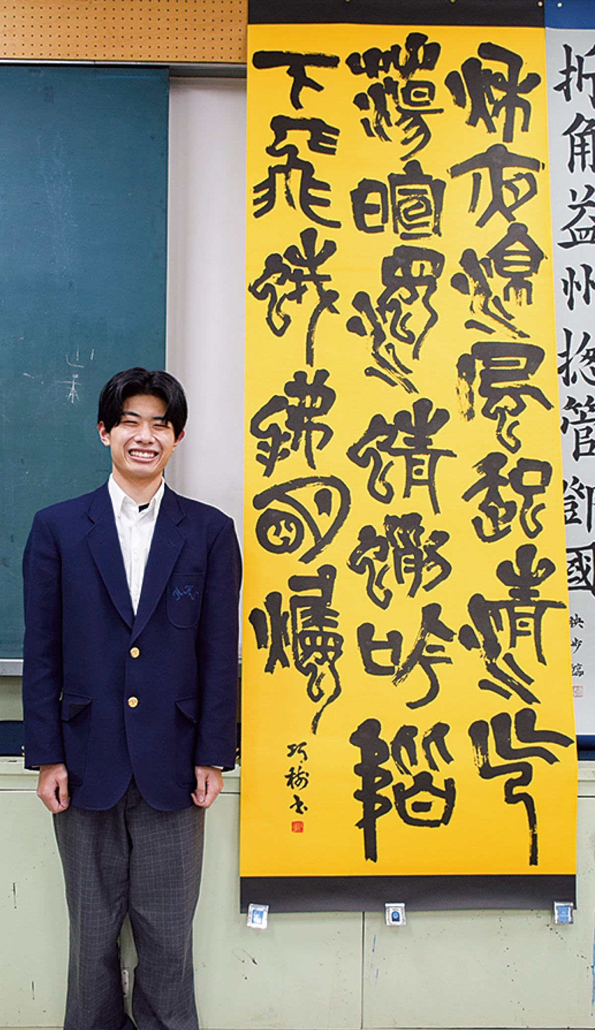 書道部の宮地広顧問は「根気強く諦めないところが彼の良い点」と評価する。後田さんは「総文出場が決まりうれしい。墨の集まっている所や余白、かすれなどで迫力のある書を表現して、できる限り上位に入れるように頑張りたい」と話し、現在は総文出展用の作品作りに没頭している。