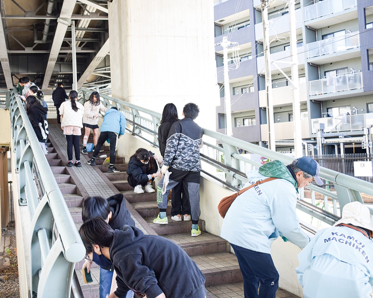 今回の清掃活動は児童から「一緒に掃除をさせてほしい」という相談があり実現したもの。清掃活動当日は、グループに分かれてごみ拾い、掃き掃除、手すりの拭き掃除のほか、ポイ捨てや落書きをしにくい環境づくりを目的に鴨居連合自治会と同小らで設置した大橋上部の壁画パネルの拭き掃除を行った。