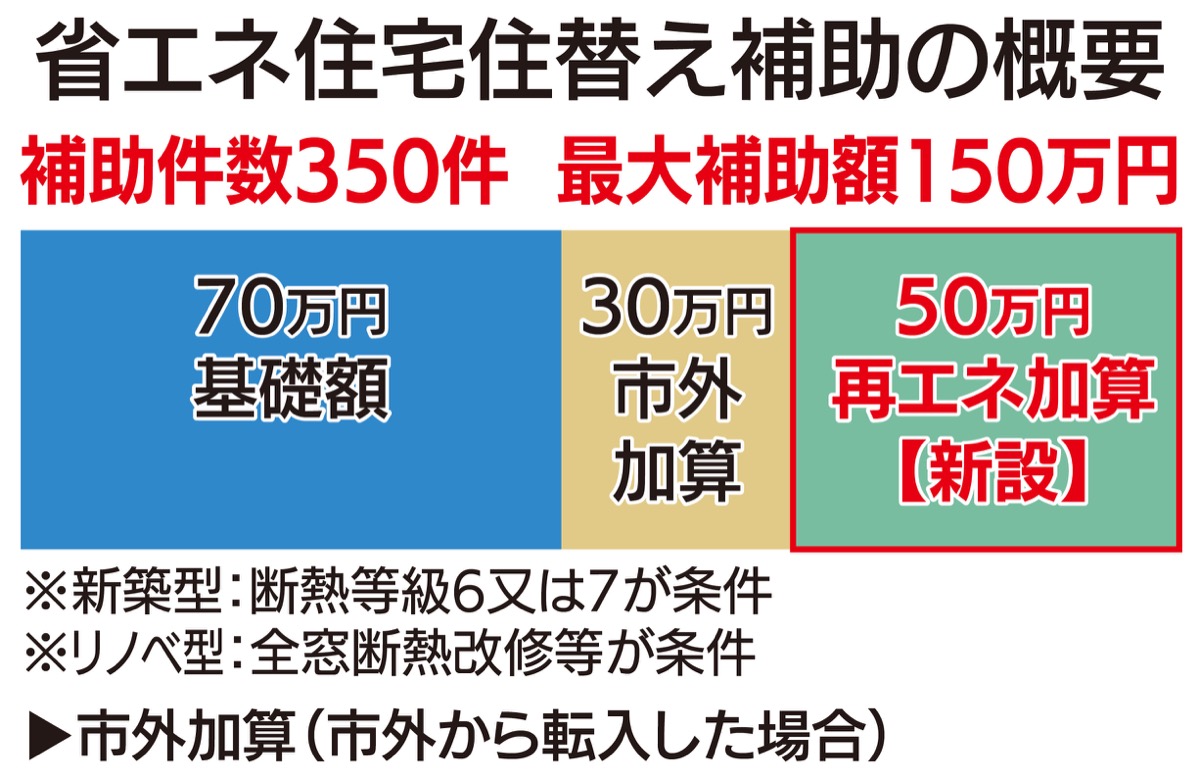 市の再エネ設備の設置について聞いたアンケートでは、設置をしない理由として7割近くが「初期設置費用が高いため」と回答。そこで今年度、最高レベルの断熱性能を備えた省エネ住宅等に住み替える費用の一部を補助する「省エネ住宅住替え補助制度」をモデル事業として実施した。対象を子育て世帯にすることで、高い省エネ性能を持つ住宅の普及と、子育て世代の市内転入・定住の促進を目指した。