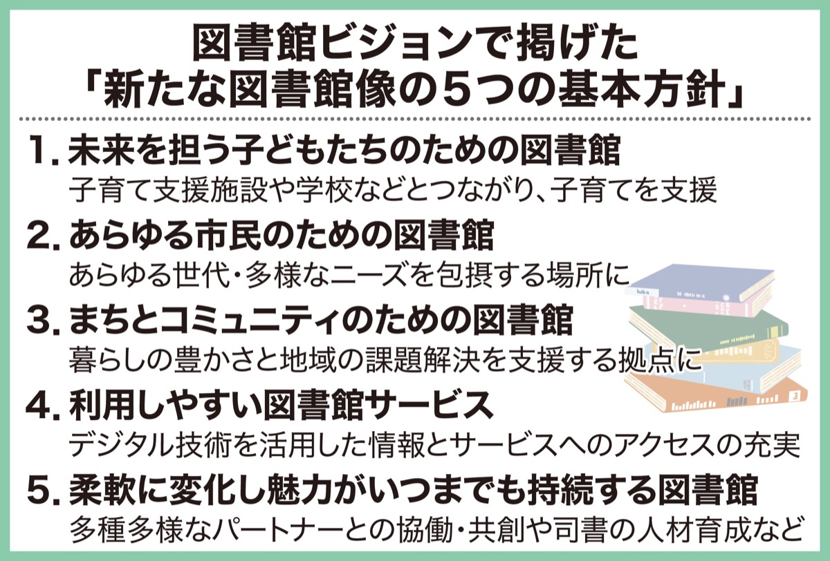 基本方針と取組の方向性の筆頭に「未来を担う子どもたちのための図書館」を掲げ、市が注力する子育て支援に沿う形となった。「子どもを連れて何度でも行きたくなる環境・施設を整える」とし、館内で体験イベントを行ったり、子どものためのスペースを作るなどの例を挙げた。方針は「あらゆる市民のための図書館」、「まちとコミュニティのための図書館」と続く。施設のバリアフリー化や市民、団体、企業などとの連携イベントをイメージし、「まちづくりのプラットフォーム」としての役割も明確にした。