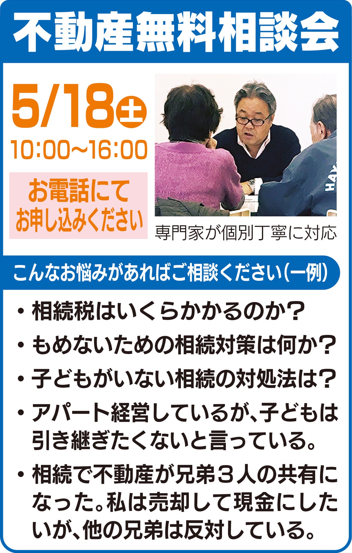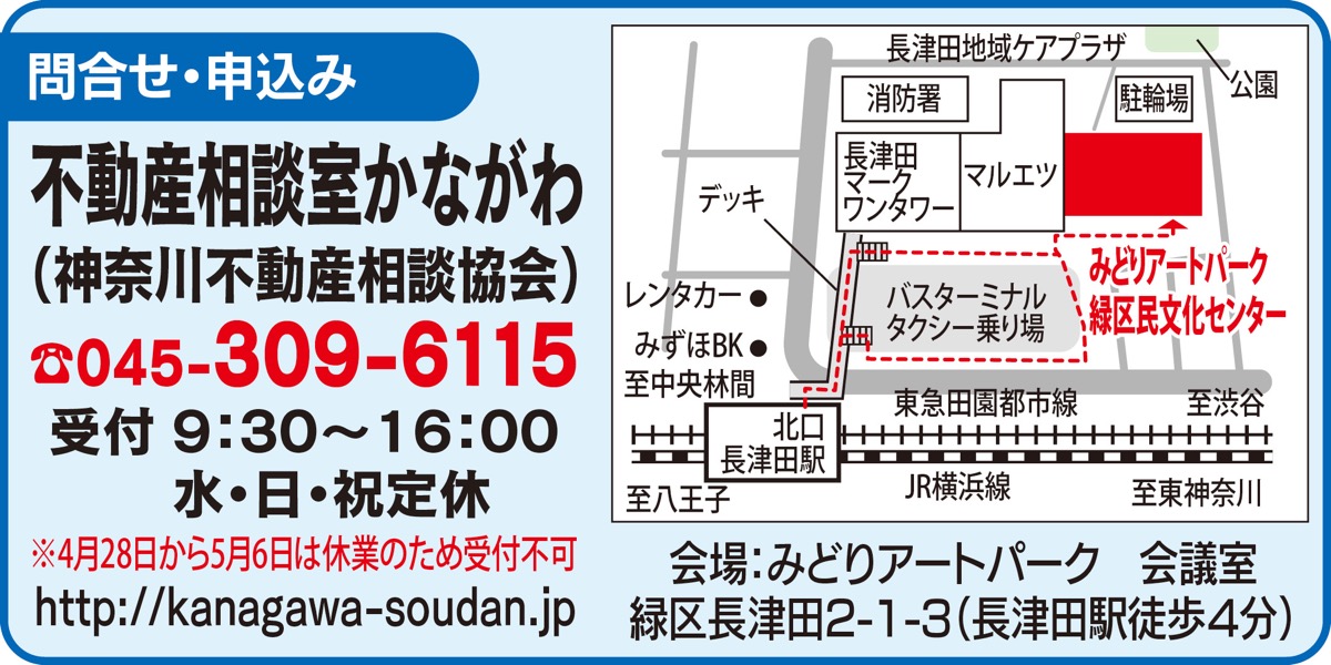 「不動産相談室かながわ」が毎月各地で開催中の相続と不動産に関する無料相談会。5月18日(土)に、みどりアートパーク(緑区民文化センター/長津田駅北口徒歩4分)で開かれる。