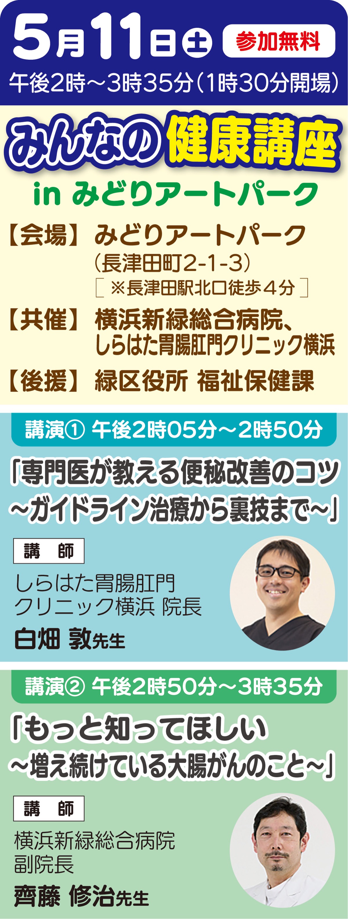 今回の講座で講師を務めるのは、白畑敦氏(しらはた胃腸肛門クリニック横浜 院長)と、齊藤修治氏(横浜新緑総合病院 副院長)。