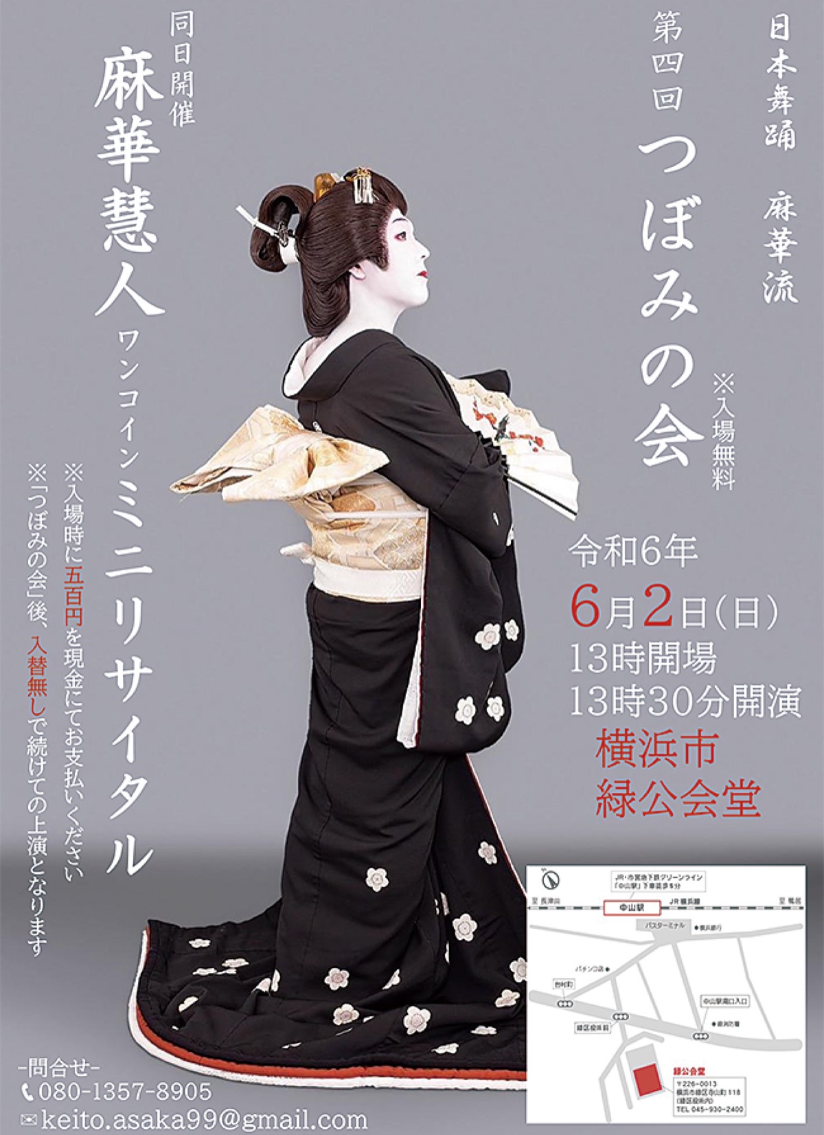 麻華流で師範を務めるのは、緑区で生まれ育った麻華慧人さん。つぼみの会の後、「麻華慧人ワンコインミニリサイタル」も同日開催する。