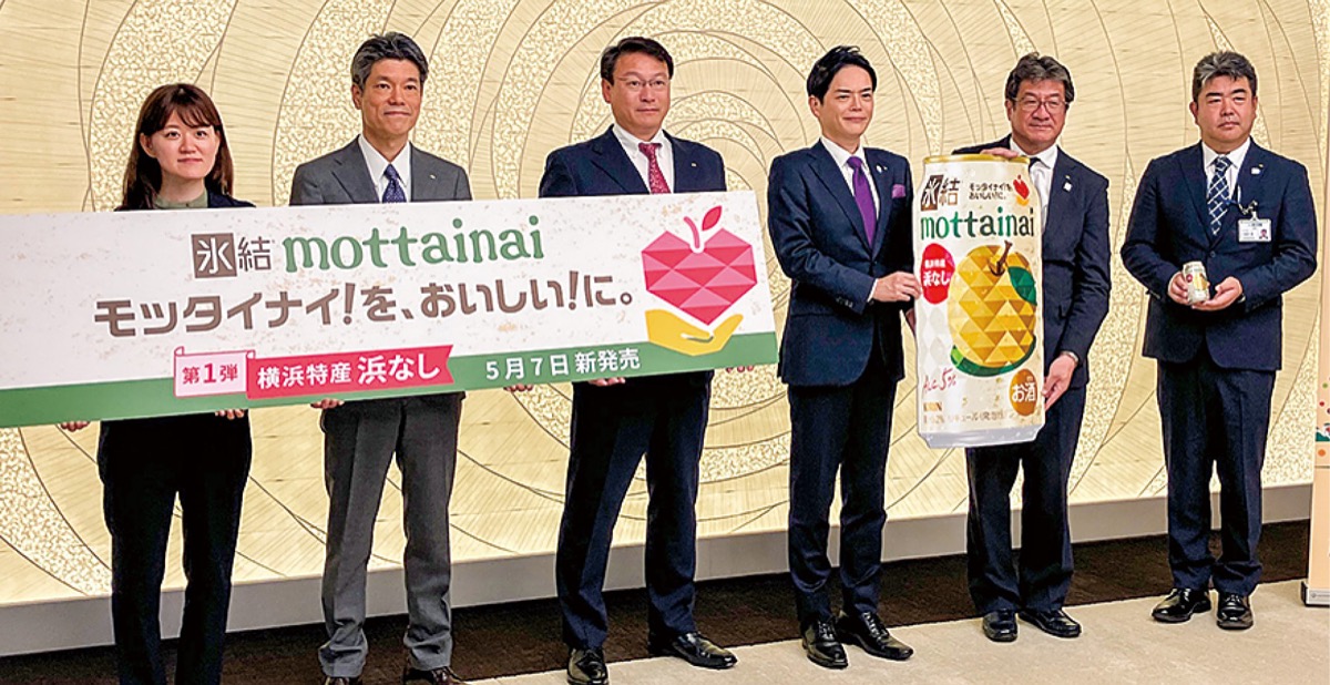 キリンビール(株)が規格外を理由に廃棄される果実を原料とした缶チューハイの新シリーズ「氷結mottainai(モッタイナイ)」を発表し、第1弾として横浜のブランド梨「浜なし」を使用した新商品を5月7日に発売した。同日には関係者が山中竹春市長を表敬訪問し、商品をPRした。
