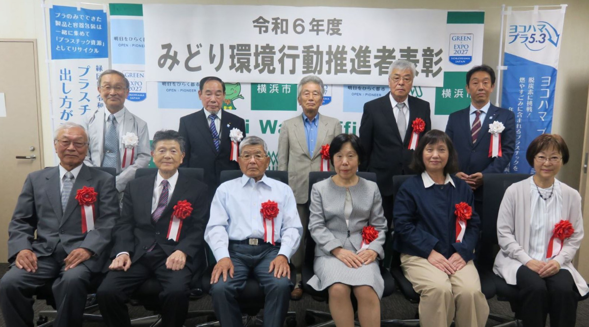 「ヨコハマ プラ5・3計画(横浜市一般廃棄物処理基本計画)」の推進のほか、地域での脱温暖化活動や美化活動などに尽力し、功績のあった個人・団体を、みどり環境行動推進協議会が表彰するもの。今年度は個人9人と2団体が表彰された(授与式には3人欠席)。今年度の被表彰者のうち、授与式出席者は以下の通り(敬称略、カッコ内は活動地域)。