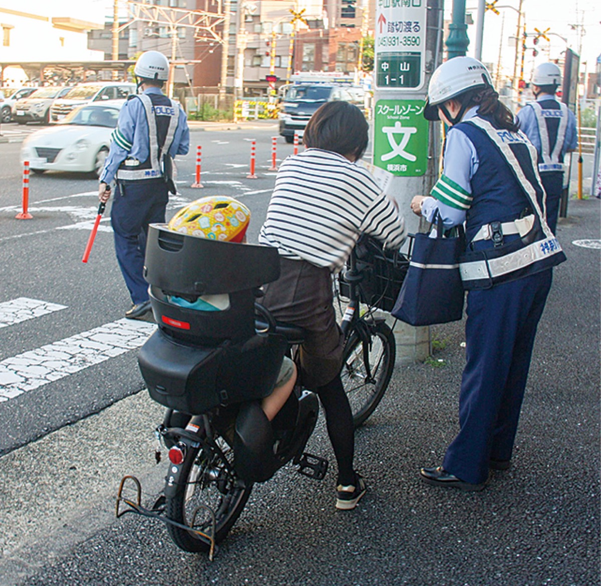 緑警察署は、信号機が無く、小学生の往来が多い区内の横断歩道で啓発活動を実施。19日は中山駅周辺にある川和踏切の北側のほか、緑区役所付近、中山駅南口側のパチンコ店付近の横断歩道で行った。歩行者や自転車運転中の人などに警察官が声を掛け、自転車運転時のヘルメット着用を促すチラシ配布や、横断歩道の正しい渡り方などを呼び掛けた。