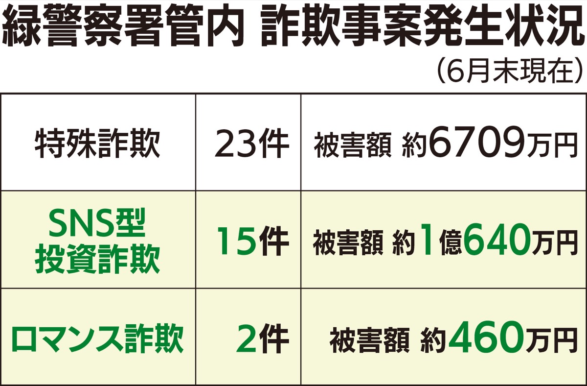 緑警察署管内でも被害が増加している。生活安全課によれば、速報値ながら6月末日までに発生した両種の詐欺は17件。そのうち15件がSNS型投資詐欺で、被害総額は約1億640万円に上る。ロマンス詐欺は2件の発生で、被害額は約460万円となっている。