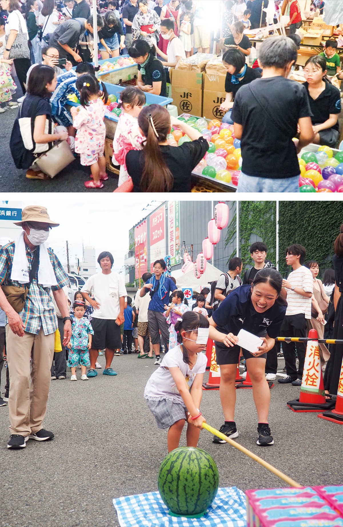 午後5時には、未就学児を対象にした「ちびっ子スイカ割り」を実施。神奈川大学の女子サッカー部も協力のもと、目隠しをした子どもたちが、前方に置かれたスイカ目がけて懸命に棒を振り下ろしていた。