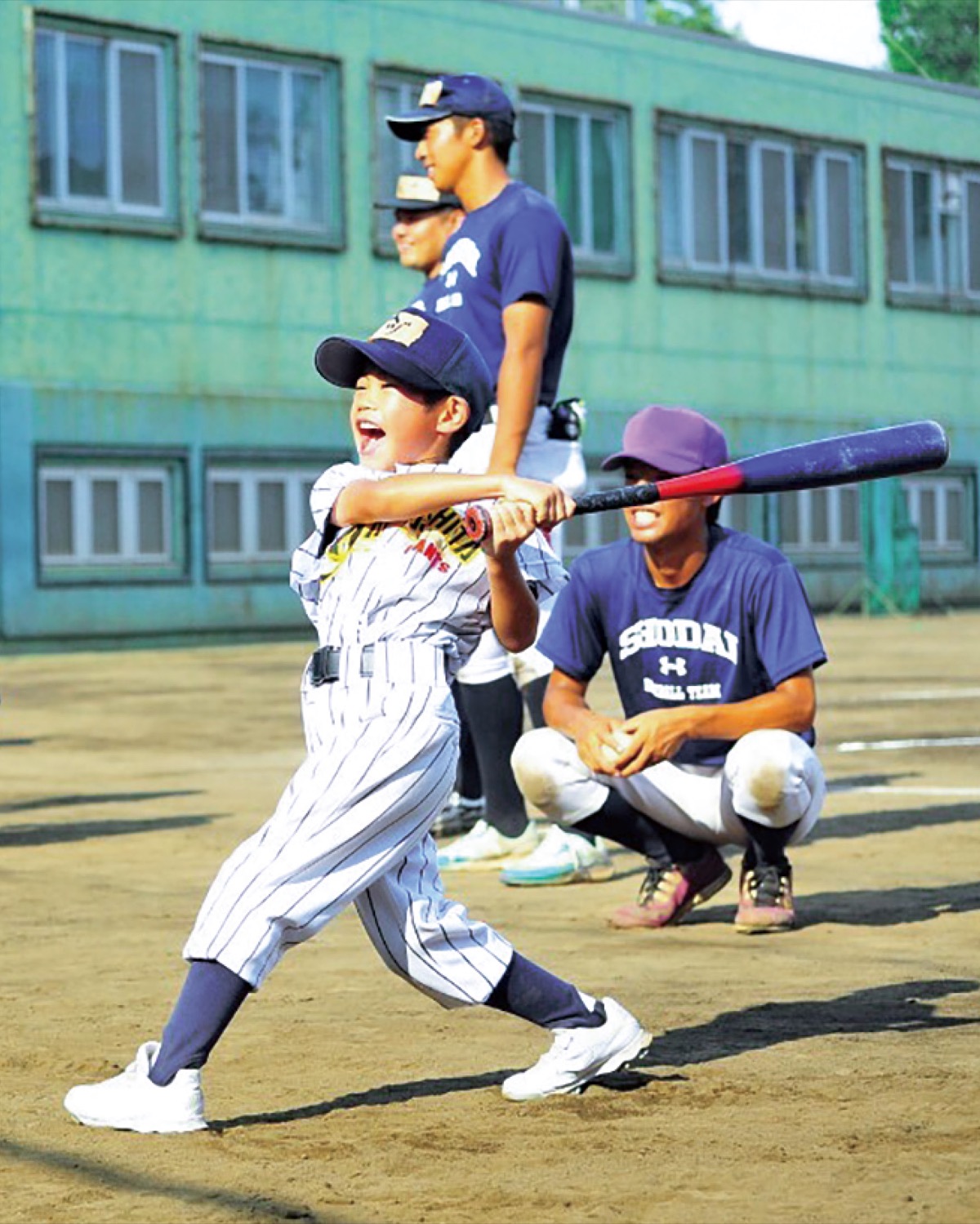 区内西八朔町のグラウンドを活動拠点とする横浜商科大学硬式野球部が8月11日、地域交流活動の一環として、近隣で活動する少年野球チーム「山下ジャイアンツ」を同グラウンドに招き、初となる交流会を実施した。