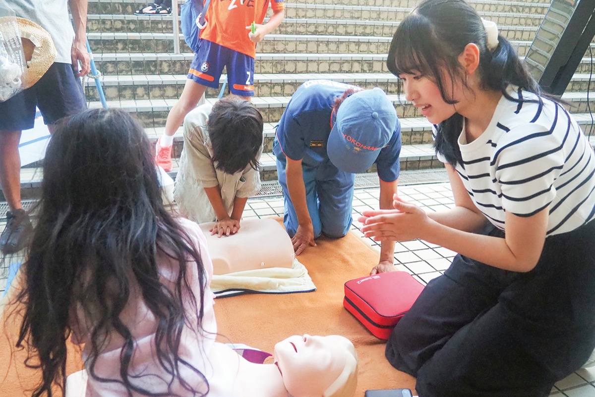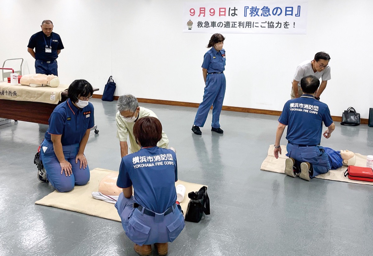 14日には霧が丘商店会で行われた「秋の縁日」で啓発活動を実施。この日は緑消防署員、緑消防団員に加え、横浜創英大学の看護学部の学生たちも協力し、心肺蘇生法などの指導にあたった。