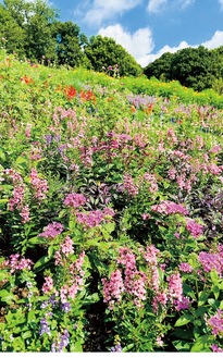 見どころは約100品種15万本の花々で彩られた市内最大級の大花壇。「煌めきの丘」をテーマにジニアやアンゲロニア、サルビア、コスモスなどが鮮やかなグラデーションを展開している。