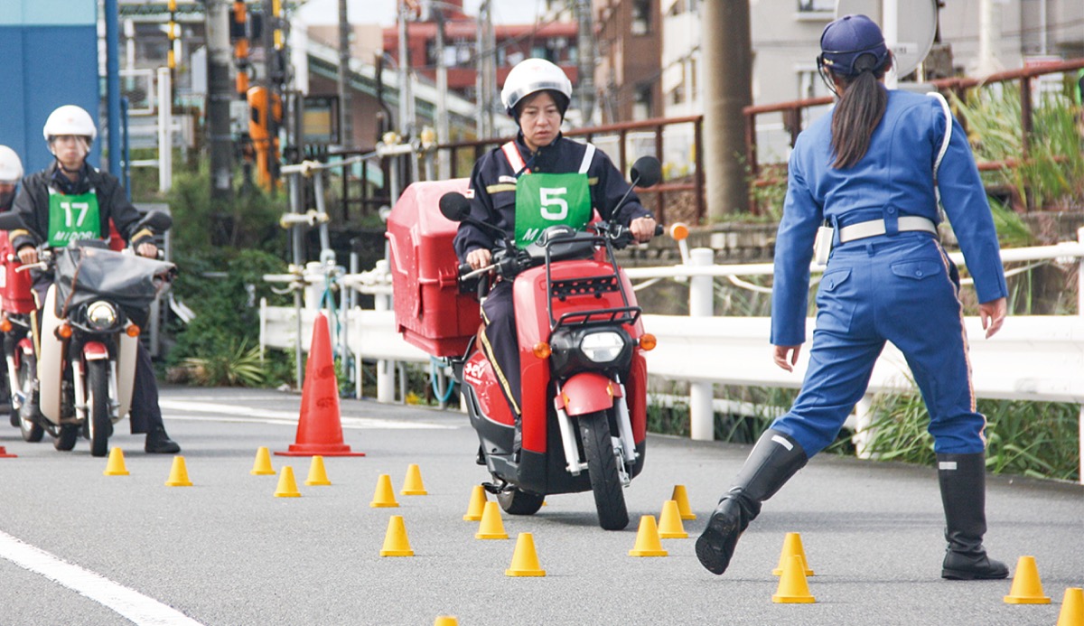 市内7区の郵便局の局員約20人が参加。配達用の二輪車に乗り、細い道の上をバランス良く低速で直進する「一本橋」や、ルート上を曲がりながら進む「低速千鳥バランス走行」など4種の実技講習を受けた。白バイ隊員は「体の重心がオートバイから離れないように」「後輪ブレーキを活用してゆっくり進んで」などと声を掛けながら指導に当たっていた。