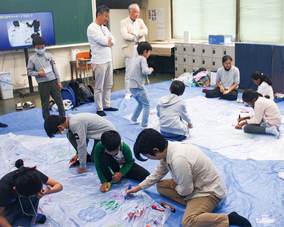 最終日の11月16日、同校の一室には親子連れ約20人が来場。KU―MAの稲葉茂副会長から、熱気球が空に上がる原理などを学んだ。熱気球の発明者とされるフランスのモンゴルフィエ兄弟に関する話などにも熱心に聞き入った参加者たち。貼り合わせたビニールに、ペンでロケットや果物、虹、オムライスなど思い思いの絵を描くなどして、熱気球の製作に取り組んだ。