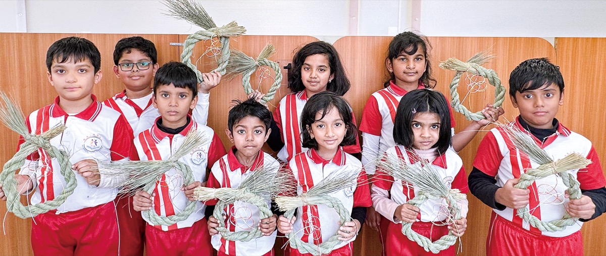 十日市場町に事務所とショップを展開する合同会社ココショク(羽生友紀子代表)のスタッフが12月3日、同町にあるインド人小学校「レインボーインターナショナルスクール」を訪問。児童に向けて、正月用のしめ縄飾りを作るワークショップを開催した。