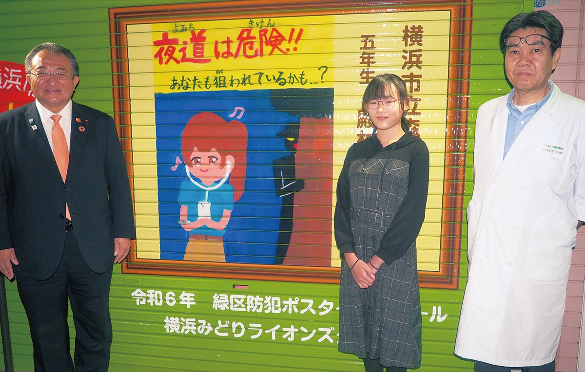 同院では2年前から、街の防犯に役立ててもらおうと、シャッターに防犯ポスターをデザインしている。今年は阿部院長が所属する「横浜みどりライオンズクラブ」が協賛した令和6年緑区防犯ポスターコンクール(緑防犯協会主催)で、同クラブ会長賞を受賞した殿村美怜さん(森の台小5年)の作品が描かれた。