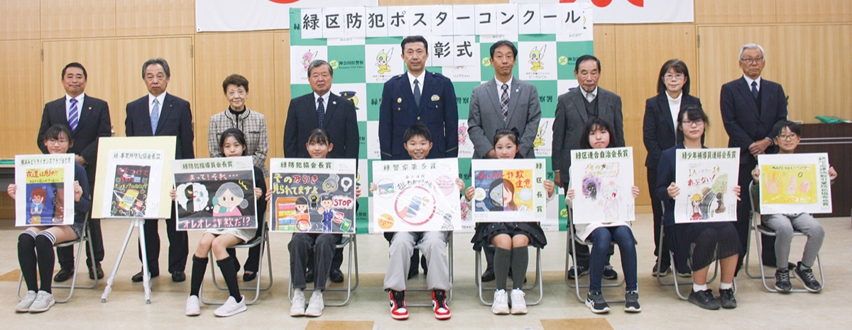 受賞者は以下の通り(順不同)。▽緑警察署長賞/山本士龍さん(竹山小6年)▽緑区長賞/平本瑠那さん(霧が丘学園小学部5年)▽緑防犯協会長賞/青栁日和さん(竹山小6年)▽緑区連合自治会長賞/藤井真美さん(上山小6年)▽緑防犯指導員会長賞/小川結南さん(竹山小5年)▽緑少年補導員連絡会長賞/小梨真優さん(霧が丘学園小学部6年)▽緑・事業所防犯協会長賞/浦山瑛士さん(上山小6年)▽緑宅地建物取引業防犯協会長賞/田中秀明さん(森の台小5年)▽横浜みどりライオンズクラブ会長賞/殿村美怜さん(森の台小5年)