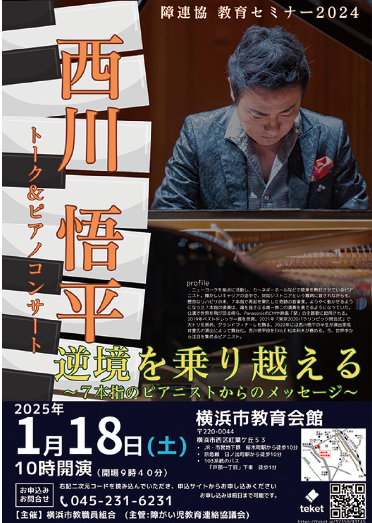 「奇跡の7本指のピアニスト」と呼ばれる西川悟平さんによるトーク&ピアノコンサートが1月18日(土)午前10時から横浜市教育会館(西区紅葉ケ丘)で開催される。主催は横浜市教職員組合、主管は障がい児教育連絡協議会。