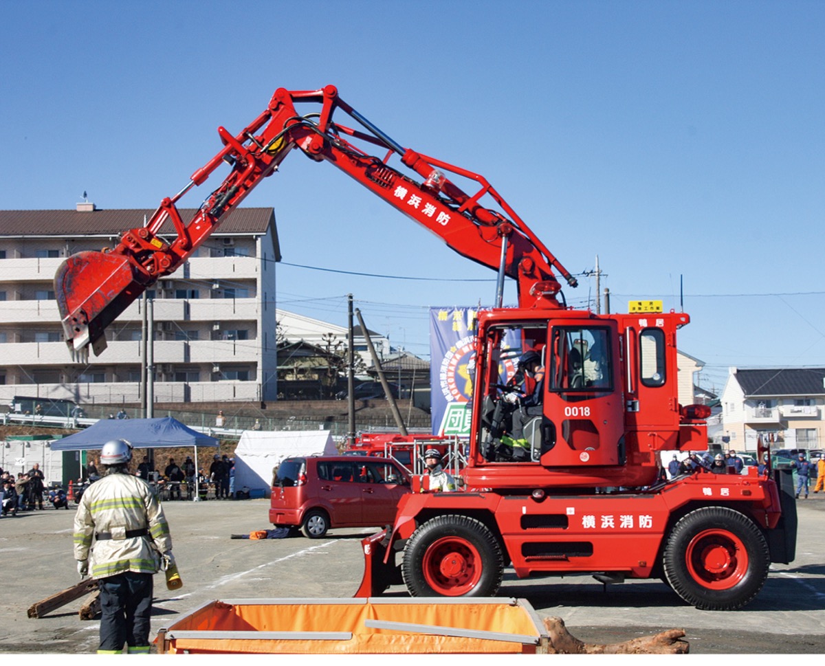 横浜市内での大規模な震災を想定した訓練も行われ、鴨居消防出張所に配備されている排除工作車が登場。同車は全国でも珍しいという格納式アーム搭載の自走式で、この日は広場に置かれた大きな木を力強く排除する様子が披露され、来場者の注目を集めていた。