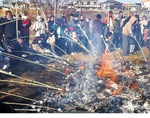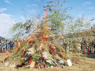 JR鴨居駅の北側を流れる鶴見川の河川敷で1月12日、どんど焼きが実施された。鴨居連合自治会(木村赳会長)の主催で、毎年1月の第2日曜日に開催されている。