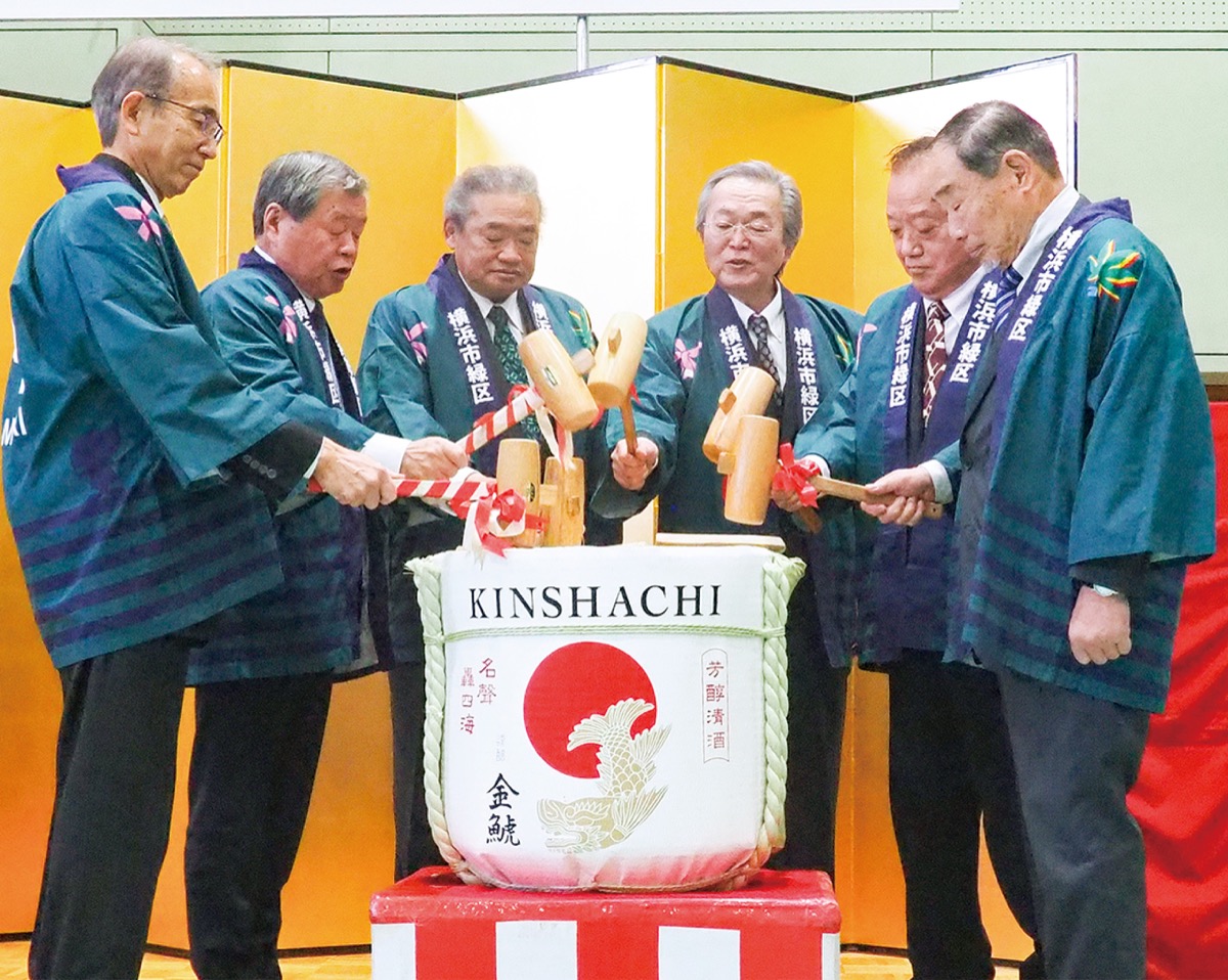 その後は実行委員会メンバーや佐藤区長、金成賢一緑警察署署長、寺山洋司緑消防署署長らも参加した鏡開きに続き、祝宴が盛大にスタート。笑顔で「今年も良い年に」と、声を掛け合う姿が至る所で見られた。