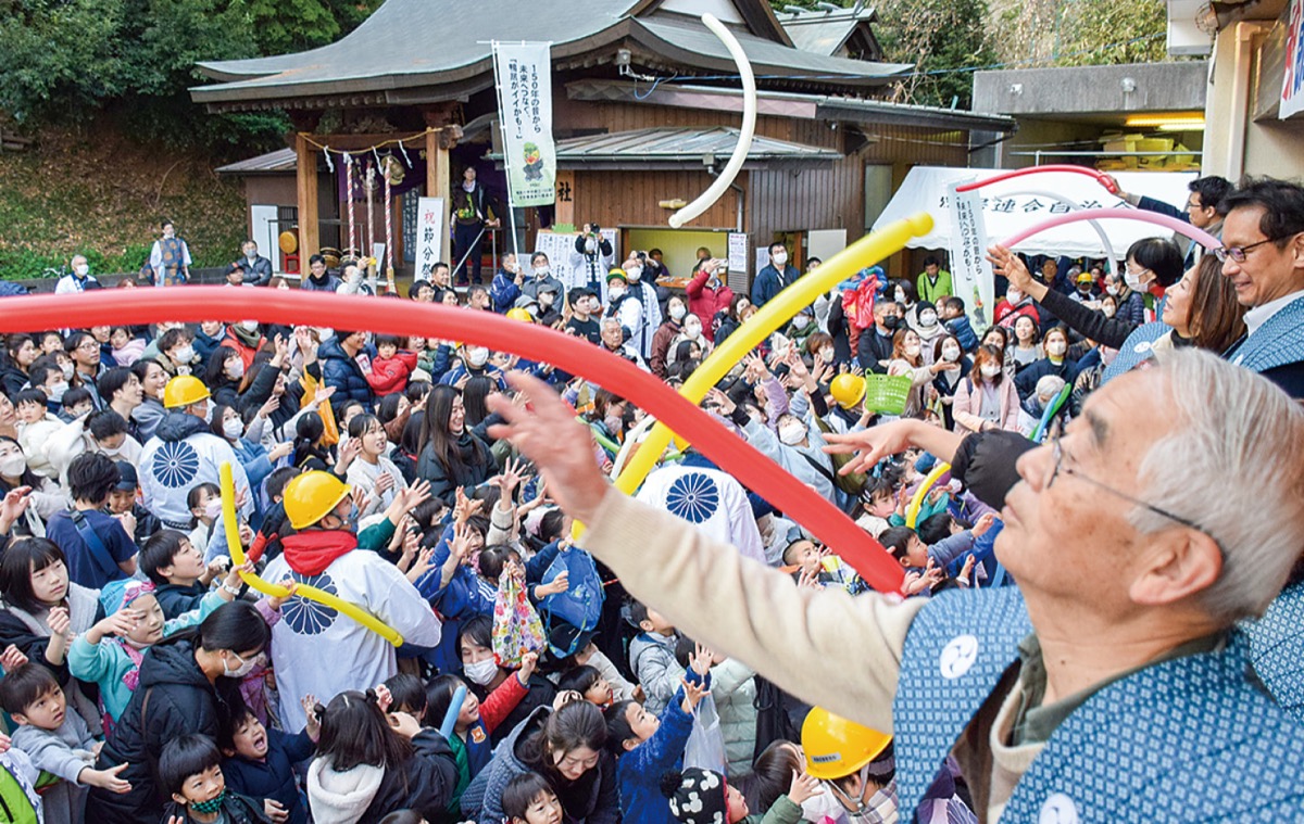 福豆(菓子・餅など)をまくのは午後2時(高齢者中心)、3時15分(小学校低学年・幼児中心)、4時30分(子ども中心)の3回。豆まきは各回10分ほどで終わるという。参加無料。