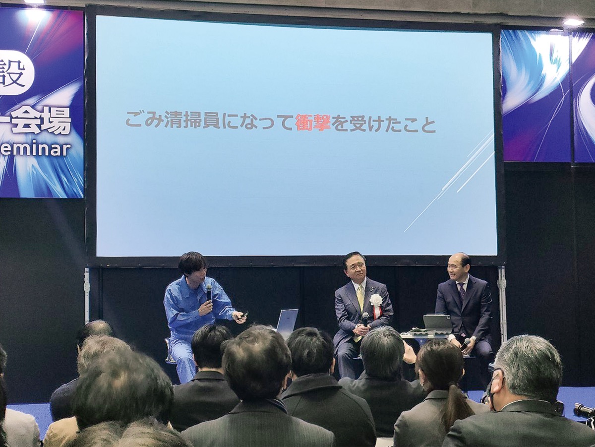 パシフィコ横浜展示ホールで2月5日から7日まで行われた首都圏最大級の工業技術・製品総合見本市「テクニカルショウヨコハマ2025」。港北区に本社を置き、リサイクル資源循環装置などを製作・販売している(株)マクニカは5日、同イベント内で特別対談「テクノロジーは、ごみを減らせるのか?」を実施。同社の原一将社長が、ごみ清掃員の肩書を持つお笑い芸人・マシンガンズの滝沢秀一さんと黒岩祐治神奈川県知事と共にごみ問題についてトークした。
