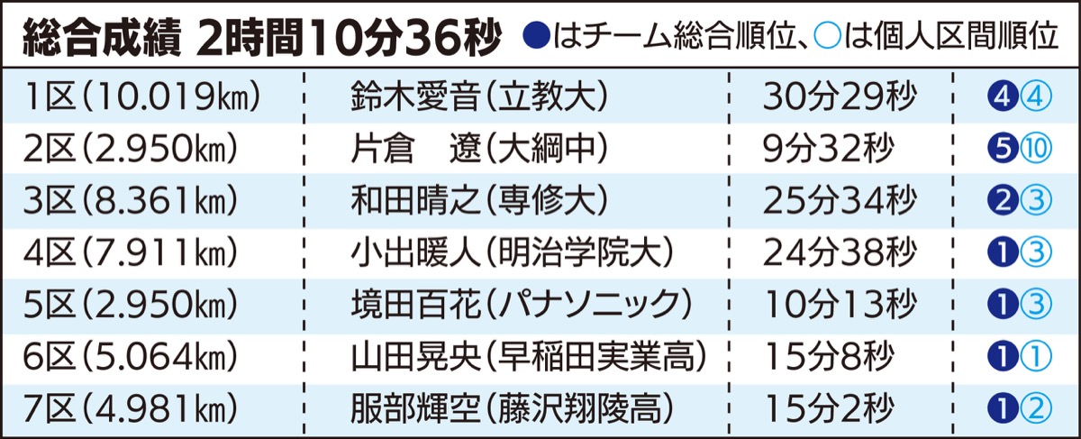 レースは、1区で樋村銀河選手(日本体育大)がトップに立った川崎市が引っ張る展開。序盤で出遅れた横浜市だが、4区の小出暖人選手(明治学院大)がトップに躍り出ると、6区の山田晃央選手(早稲田実業高)は区間1位の快走を見せ、他を突き放し、優勝を飾った。