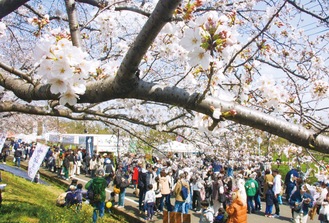 大勢が来場し、多数参加した飲食販売やゲームなどのブースに長蛇の列ができていた。鶴見川沿いに開花したサクラの下では、多くの家族連れなどが花を眺めながら食事を楽しんでいた。